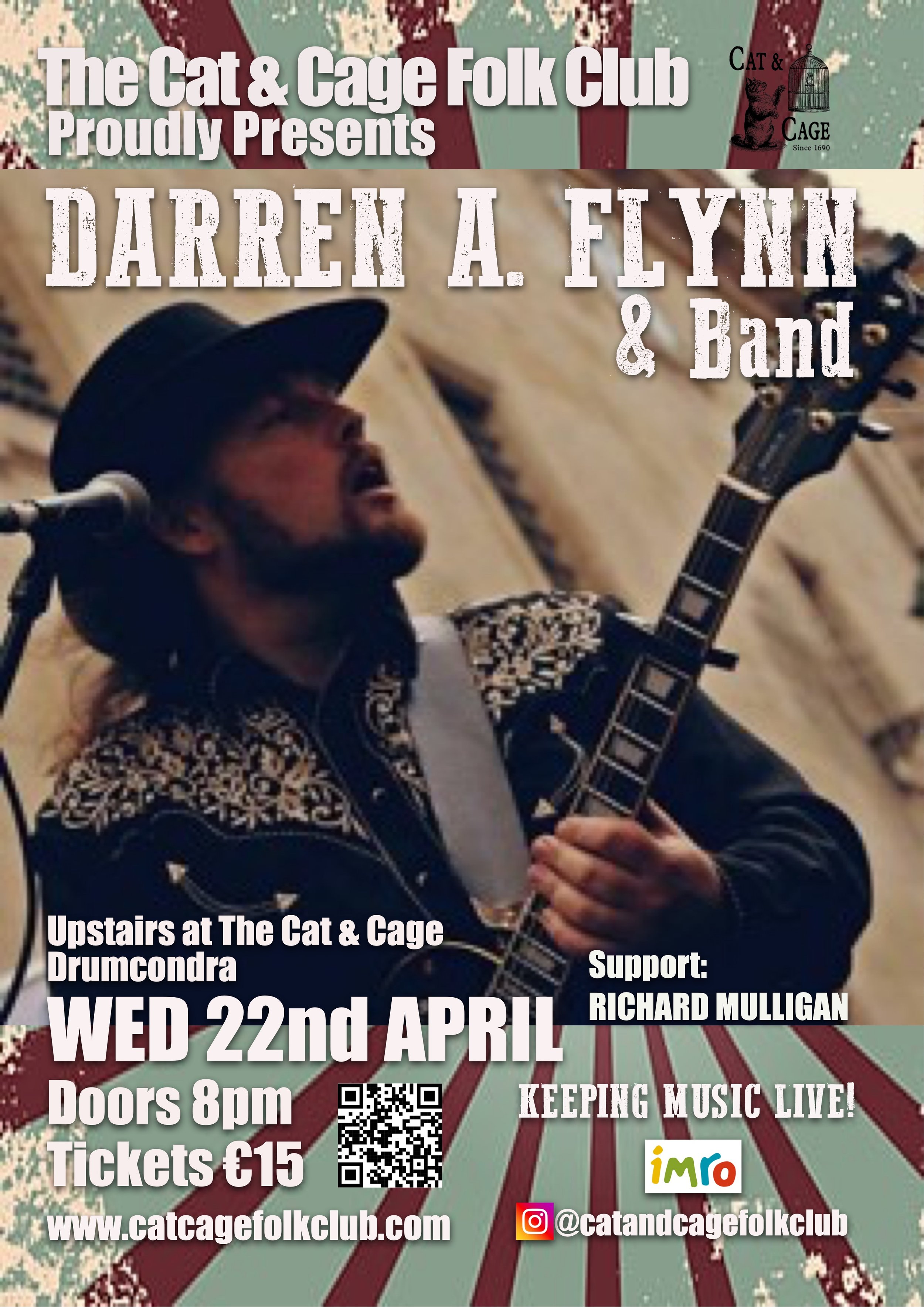 Darren A. Flynn is an award-nominated singer-songwriter from Dublin. His music covers a spectrum of classic Americana, from folky introspection right thru to good old fashioned Rock & Roll. It has been described as "compelling" (Irish Times) and with "a great bustling, rousing energy" (Irish Mirror). Darren has performed at myriad Irish festivals & internationally in Denmark, the UK, Spain, France, Germany, the Netherlands & Italy. Come on down for a stomping night, with support from local Country singer-songwriter Richard Mulligan.